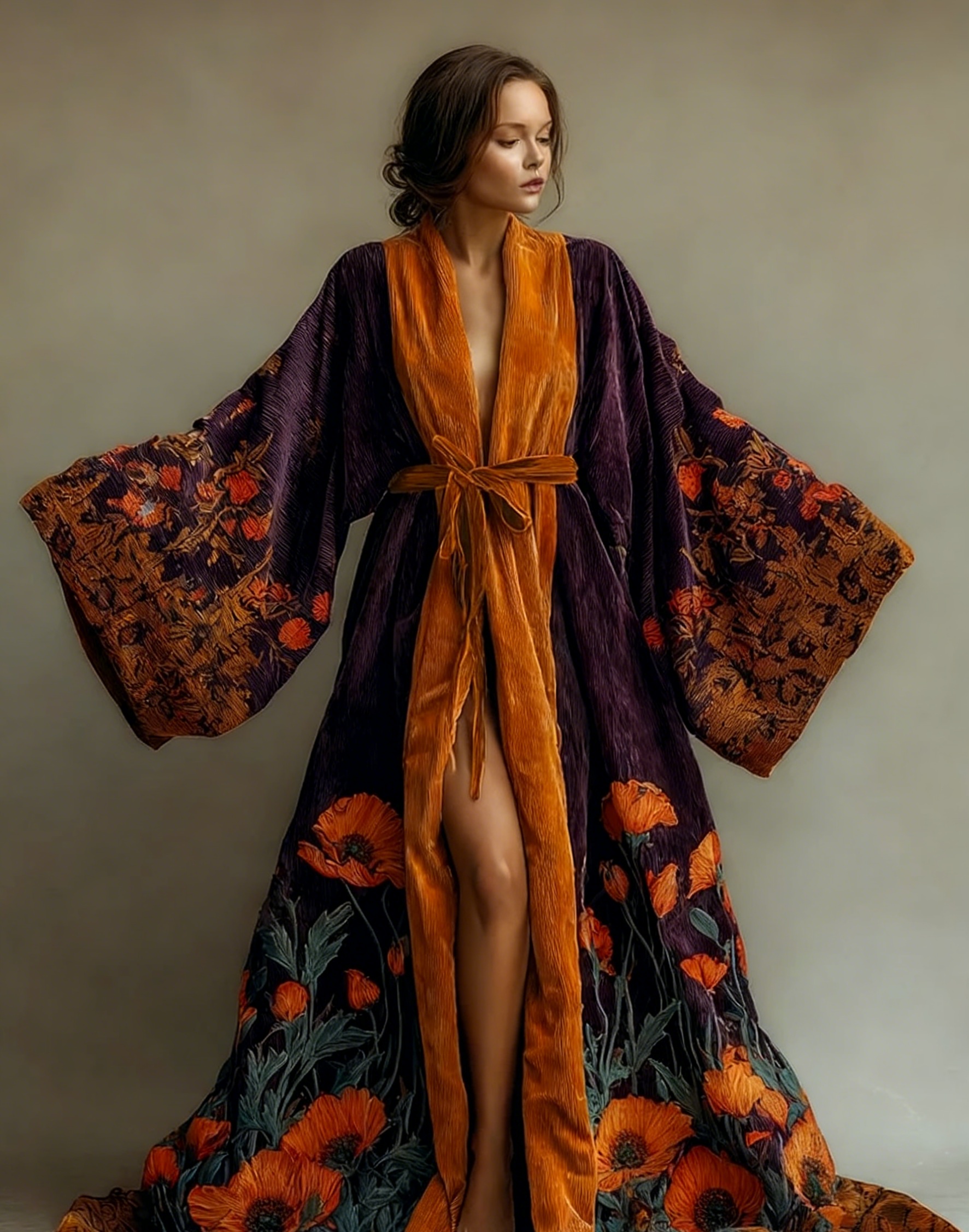 Abstract Art Print Kimono Long Gown Autumn and Winter Robe With Belt