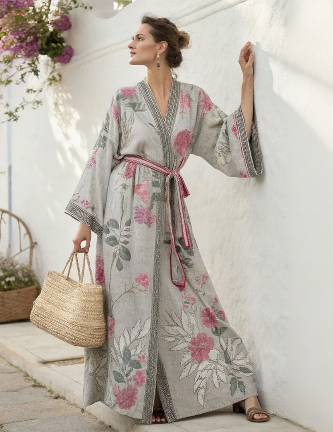 Artistic floral resort pattern kimono robe (with belt)