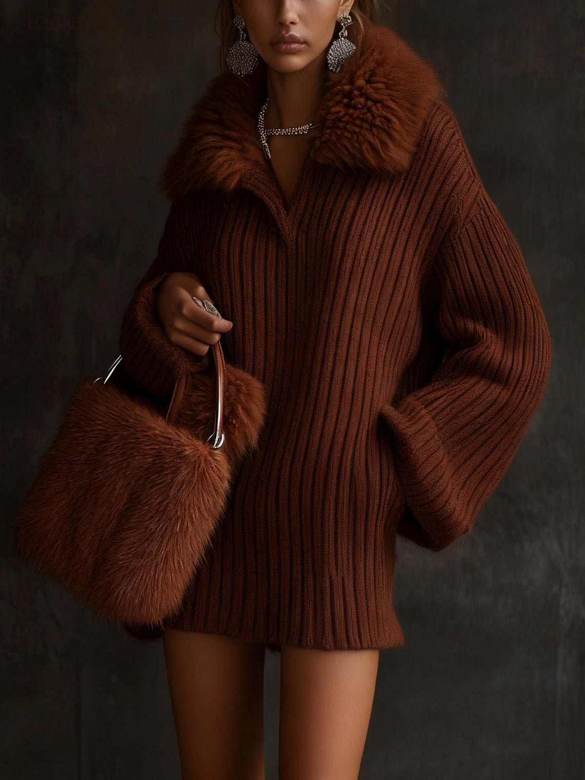 Brown Ribbed Knit Dress With Faux Fur Collar