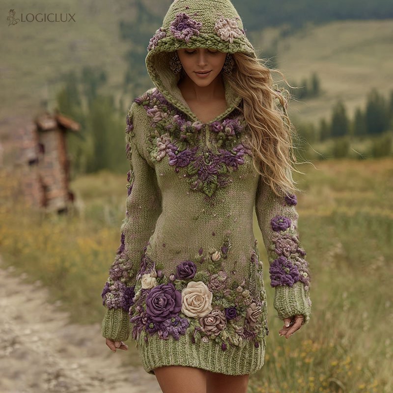Classy Gradient Purple Lavender And Floral Art Cozy Knit Mini Hooded Dress