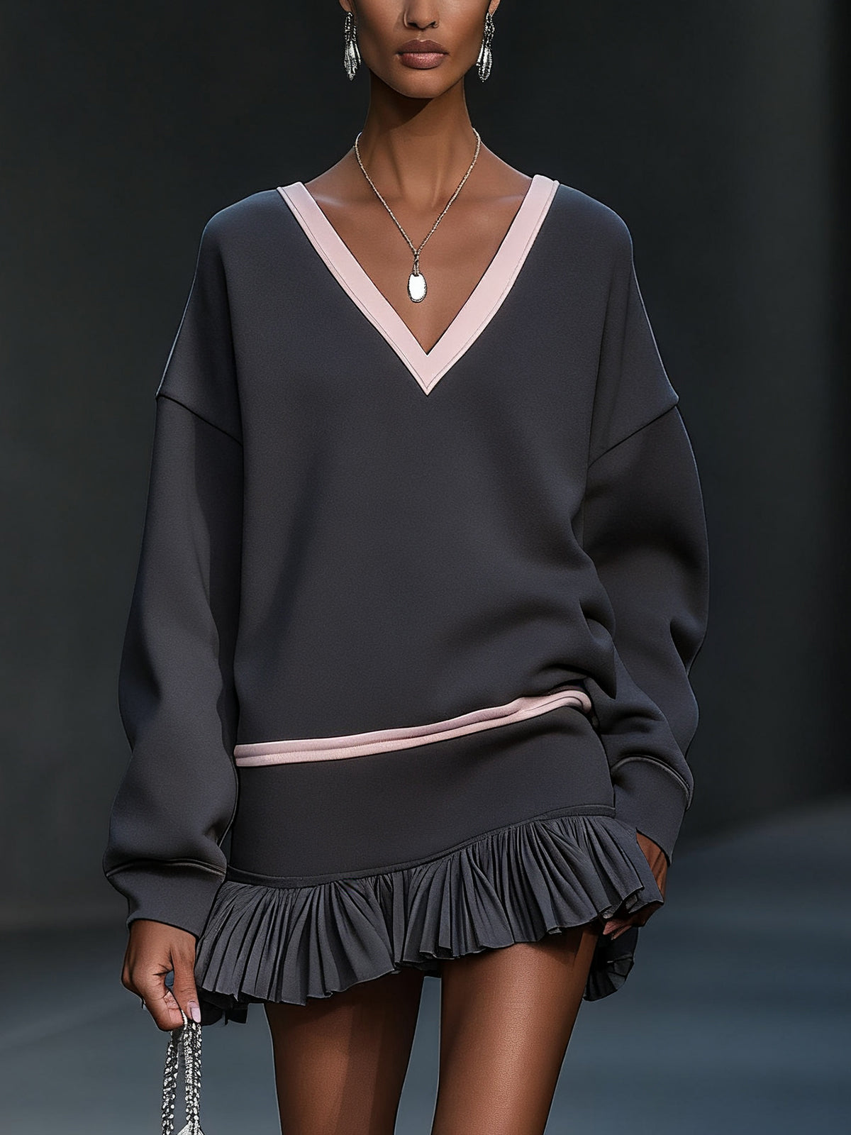 Gray Dress With Blush Accents And Pleated Hem