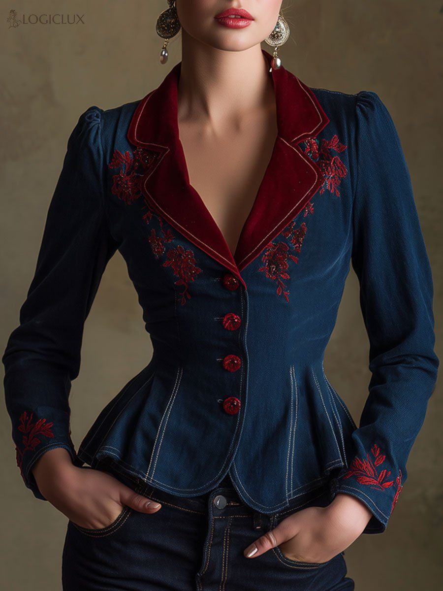 This retro velvet lapel embroidered dark blue denim fitted ruffled blazer is a striking piece that seamlessly blends classic elegance with a modern edge. Crafted from high-quality dark blue denim, the blazer offers a structured and flattering fit that accentuates the silhouette. The standout feature is its luxurious velvet lapels, which add a touch of sophistication and contrast beautifully with the denim fabric, creating a rich and textured look.