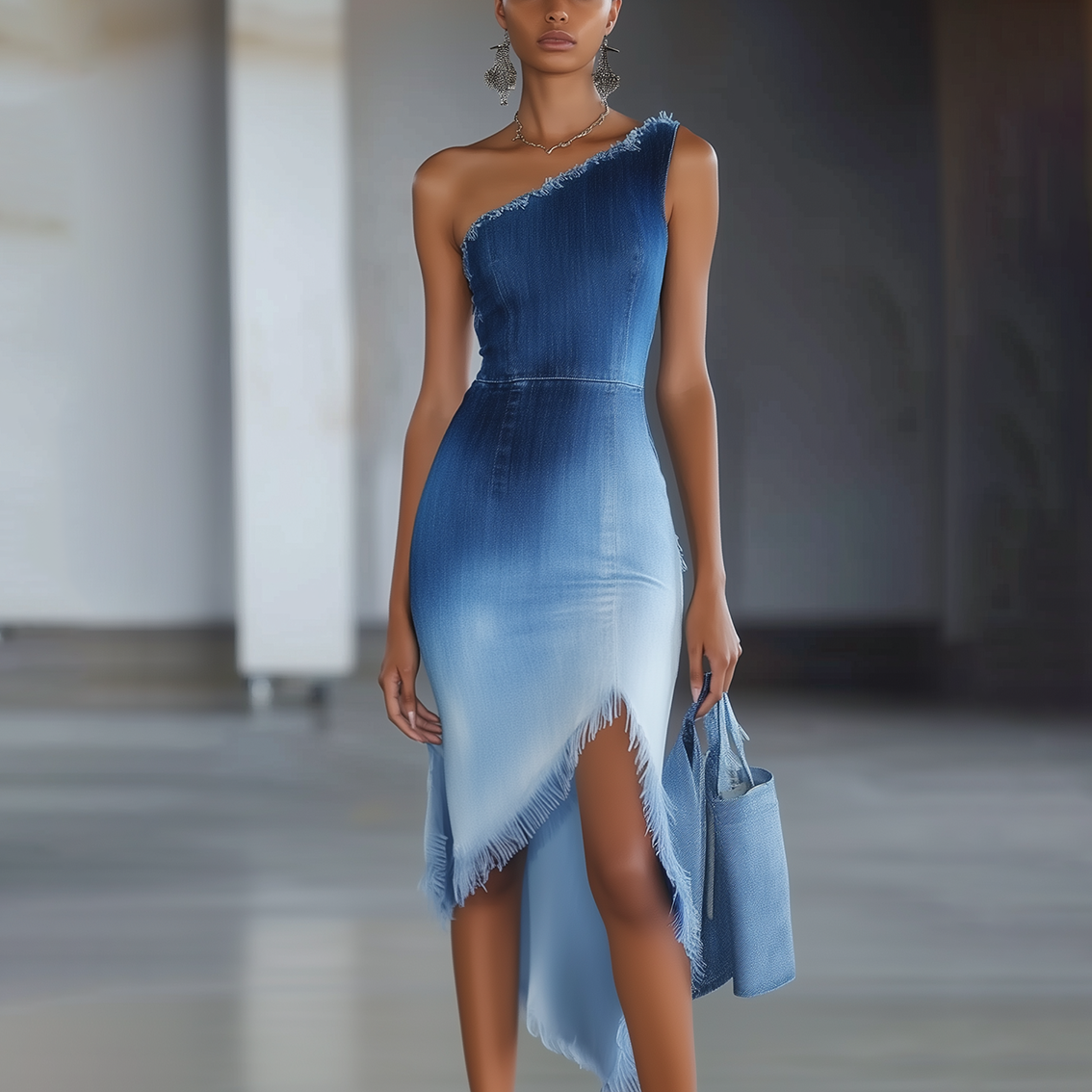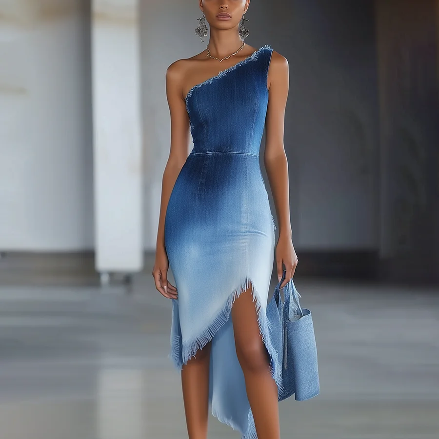 Retro one-shoulder design and irregular hemline make this denim midi dress a must-have for fall & winter festive wardrobes. 👗✨