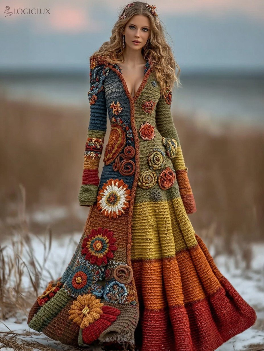 Vintage Floral Crochet Colorblock Cozy Maxi Sweater Dress