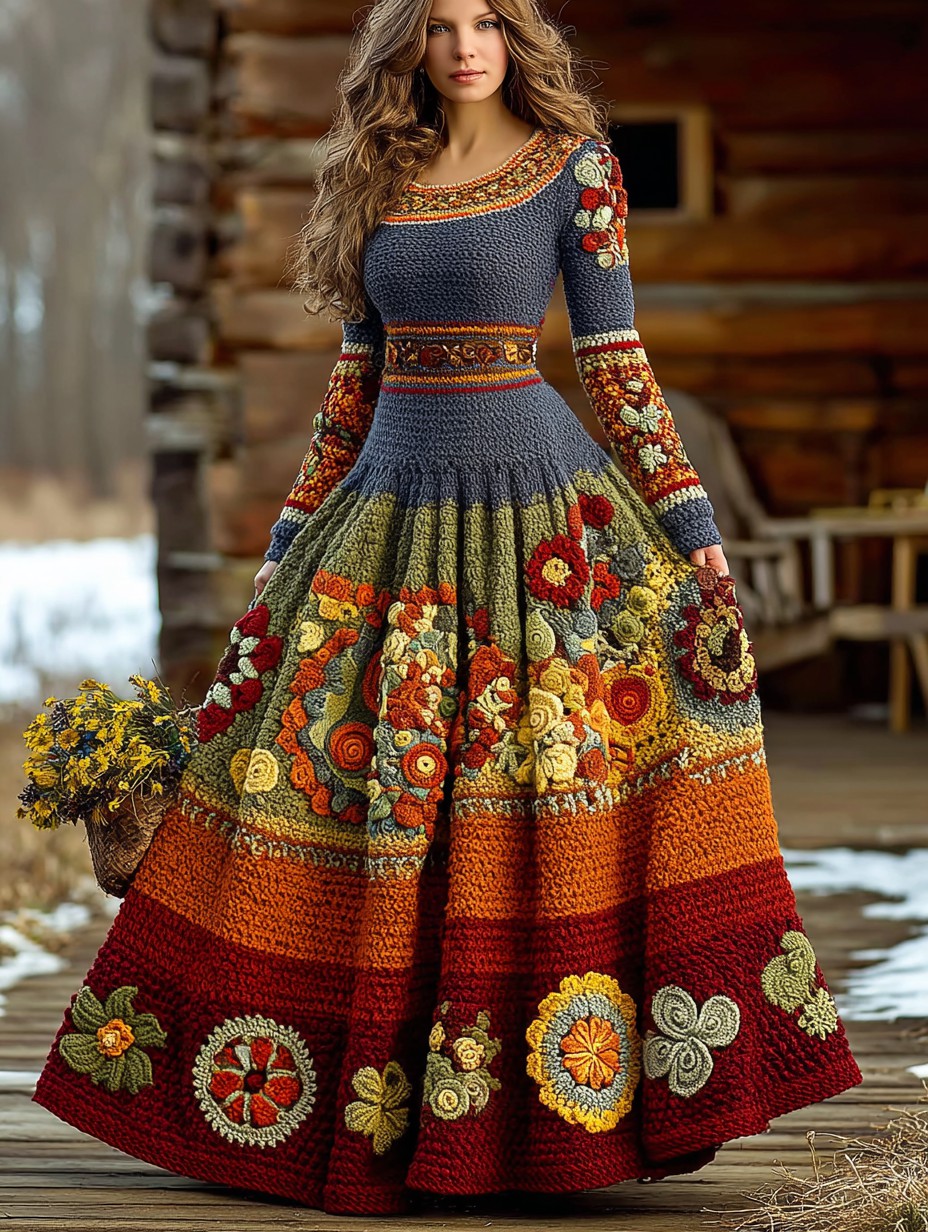 Vintage Floral Crochet Colorblock Cozy Maxi Sweater Dress