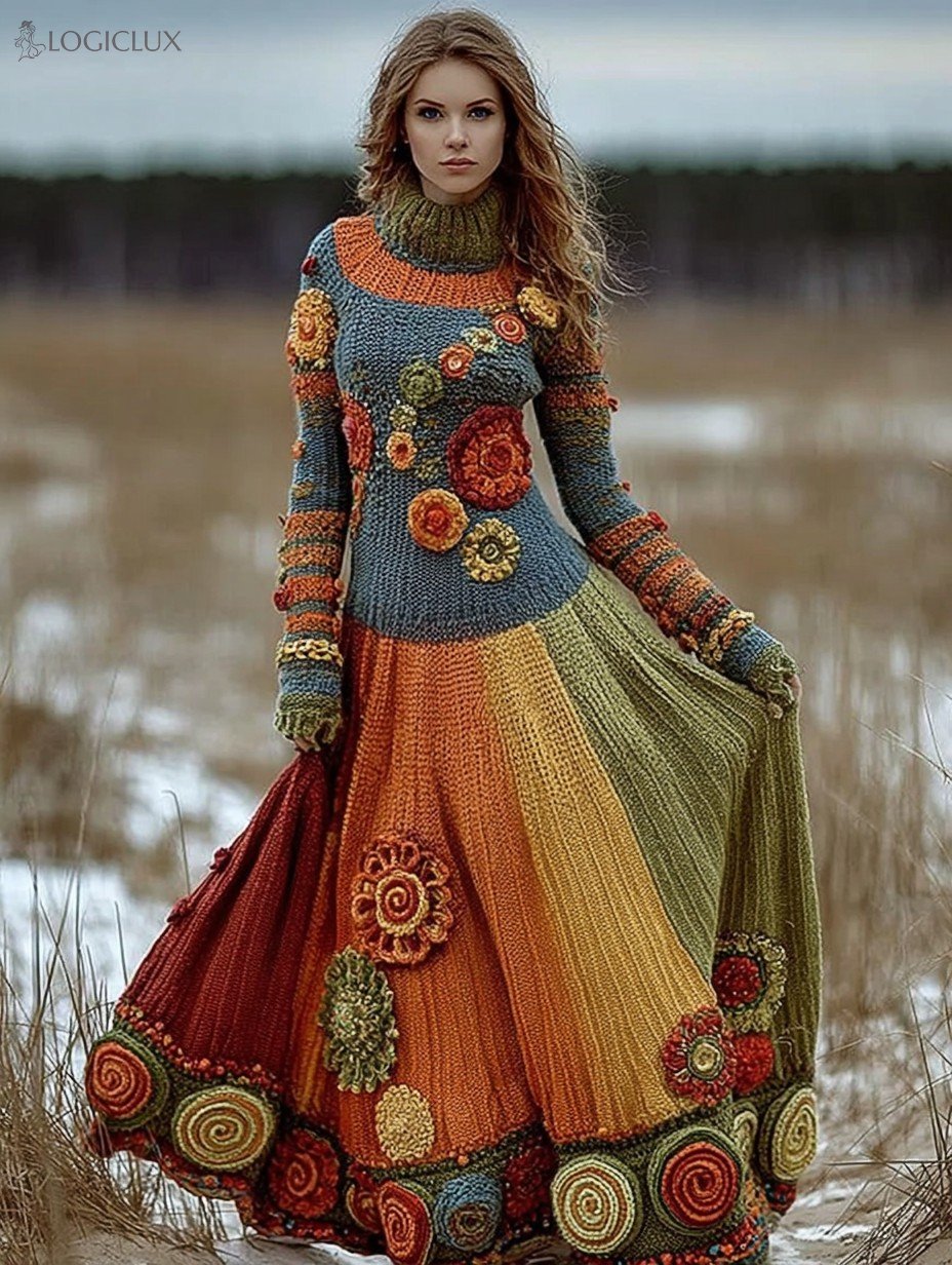 Vintage Floral Crochet Colorblock Cozy Maxi Sweater Dress