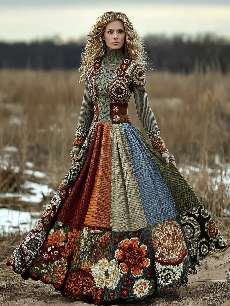 Vintage Floral Crochet Colorblock Cozy Maxi Sweater Dress