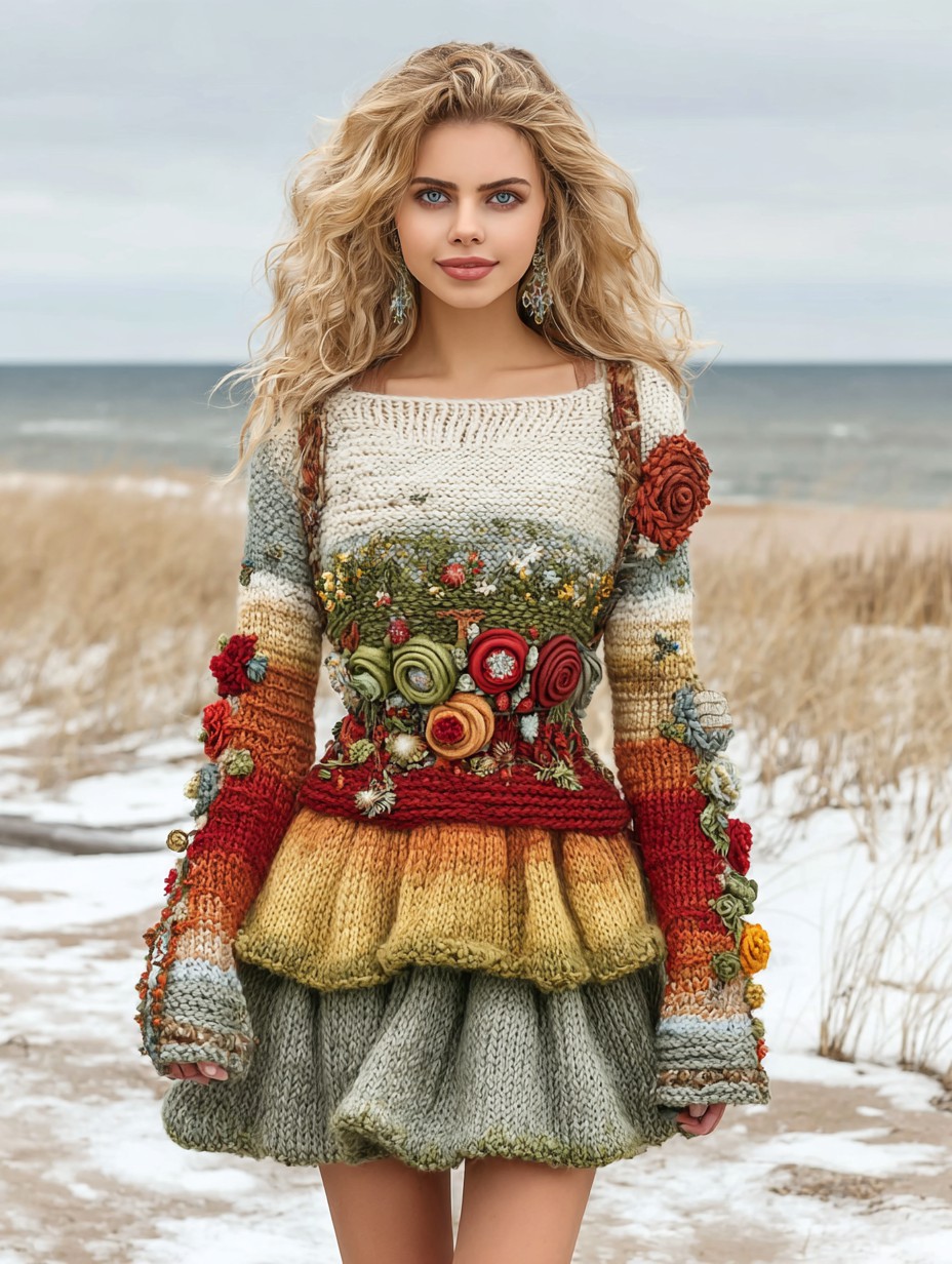Vintage Floral Crochet Colorblock Cozy mini Sweater Dress