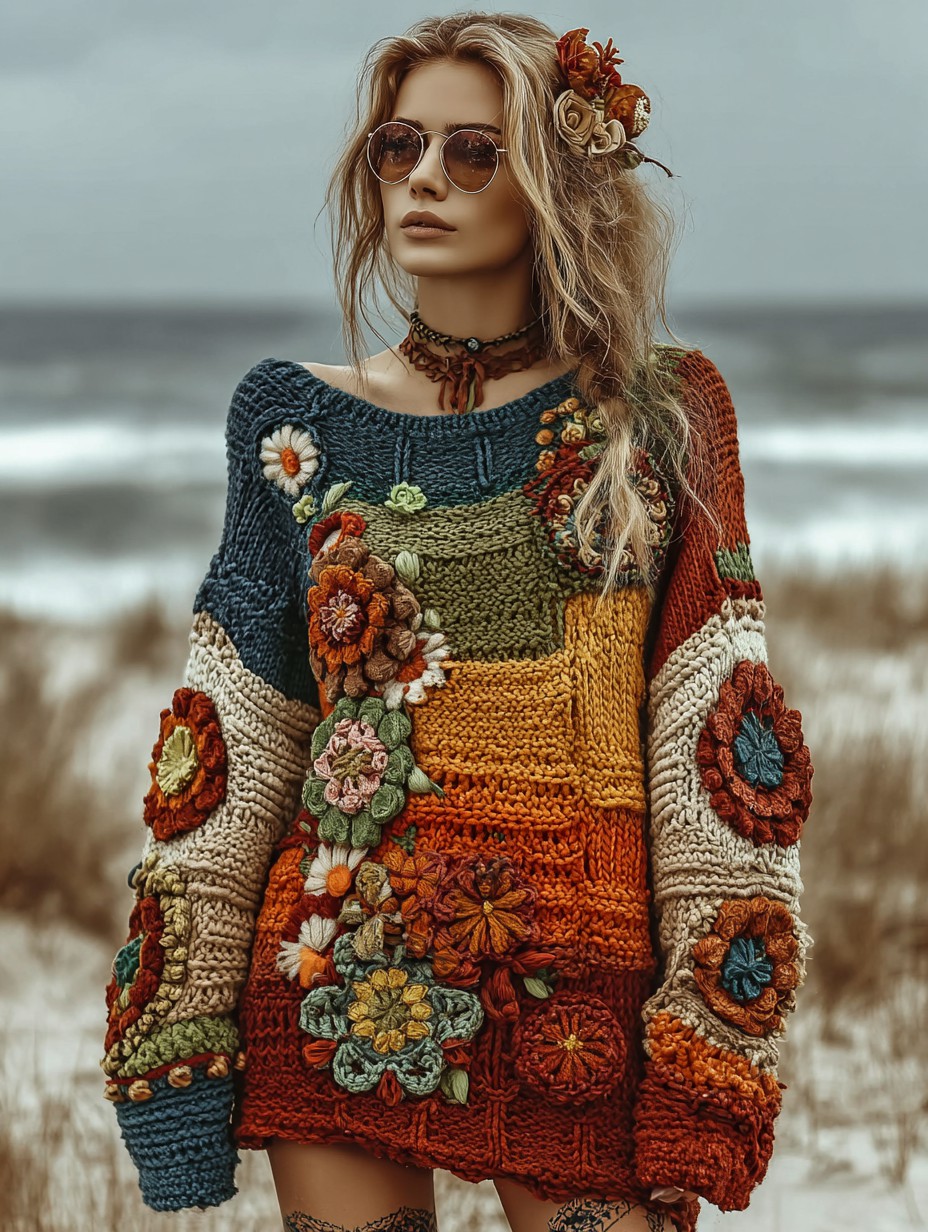 Vintage floral crochet multi-color patchwork comfortable knitted pullover sweater