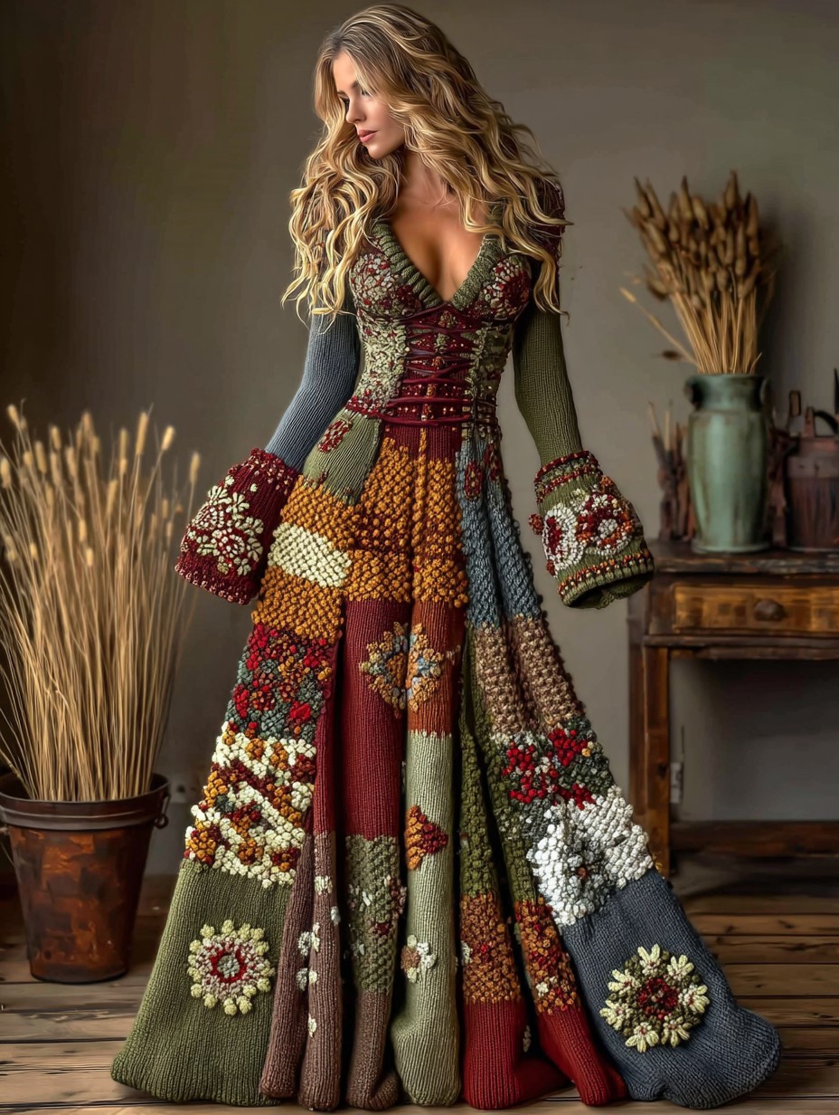 Vintage Floral Crochet Colorblock Cozy Maxi Sweater Dress
