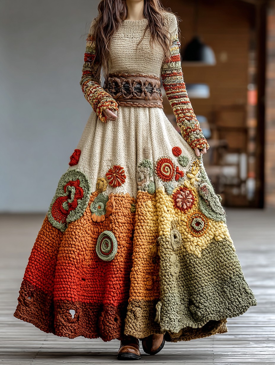 Vintage Floral Crochet Colorblock Cozy Maxi Sweater Dress
