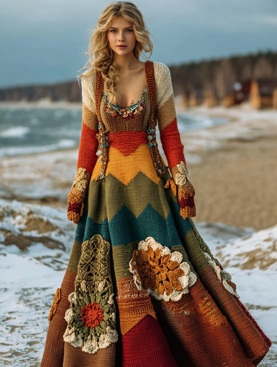 Vintage Floral Crochet Colorblock Cozy Maxi Sweater Dress