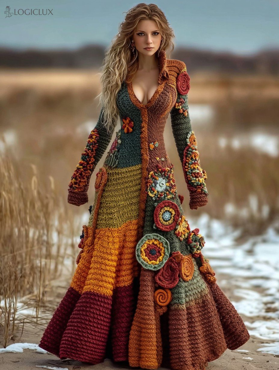 Vintage Floral Crochet Colorblock Cozy Maxi Sweater Dress