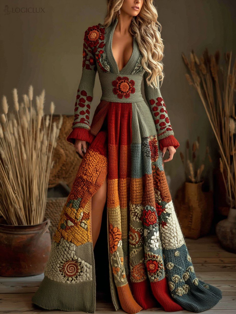 Vintage Floral Crochet Colorblock Cozy Maxi Sweater Dress