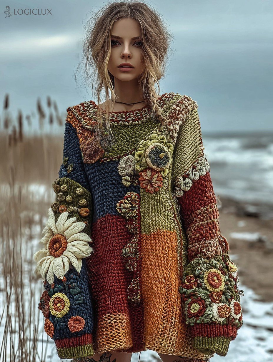 Vintage floral crochet multi-color patchwork comfortable knitted pullover sweater