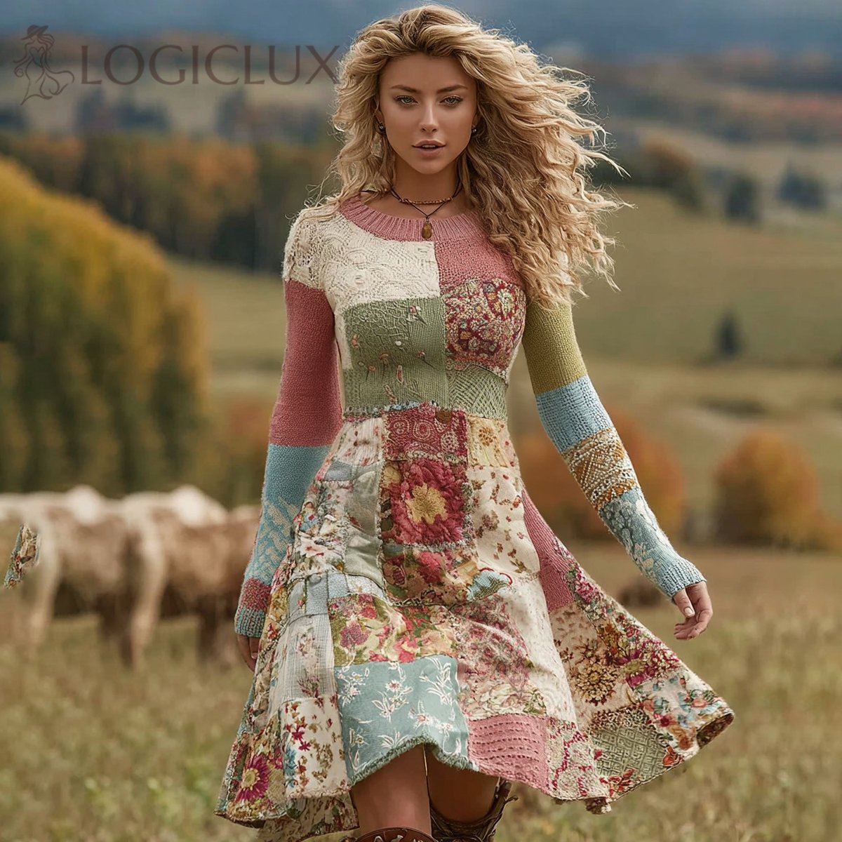 Women's Vintage Patchwork Floral Art Cozy Knit Sweater Dress